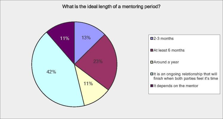 The biggest group of respondents (101), although not the majority (42%), think that the mentoring period being an on-going relationship should finish when both parties feel it’s time. Significantly fewer (54) respondents think it should last at least 6 months whereas 30 persons (13%) set the minimum at 2-3 months. 27 think it depends on the mentor, followed by26 respondents (11%) who think it should last around a year.